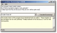 Google Translator Boomerang is a silly little program that uses the Google Translation engine to translate your english text to foreign languages and then back again into english, for some amusing results. Use it to generate zen poetry or examine how well the translation of your text really matches with your intentions. You might be surprised to learn how your words may come across in another language.