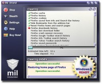 Mil Shield also cleans: AutoComplete forms and passwords, all WebCacheV01.dat and Index.dat files, temporary Internet files, cookies, UserData records, evercookies, typed URL history, browse history records, most recently used download folder, recent documents history, most recently used folders records of the Windows shell, common file dialogs history, file and computer search history of the Windows shell, Start menu Run history and list of frequently used programs, Recycle Bin at low level, Windows temporary files, and restores your home page if it is hijacked.