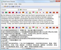 MultiTranse Oriental is a versatile translation suite for 12 eastern languages, including Indonesian, Thai, Filipino (Tagalog), Chinese, Persian, Japanese, Korean, Turkish, Arabic, Vietnamese, Hindi, Hebrew, as well as 5 European languages - English, French, German, Spanish and Italian. The software is intended for translating sentences and small texts and has a limitation of 6000 characters per translation. MultiTranse works with texts in the Unicode format, but users can enter and save texts in any available ANSI encoding. Translated texts can be instantly printed or used in an email message, so it will take mere seconds to translate a text from one of the European languages to any of the supported eastern languages with great quality! The software features an intuitive and user friendly interface that will only prompt you to specify the working language pair. MultiTranse offers a unique alloy of a linguistic instrument with a purely business tool that will help you keep your finger on the pulse of your eastern partners and colleagues and be constantly in sync with them!